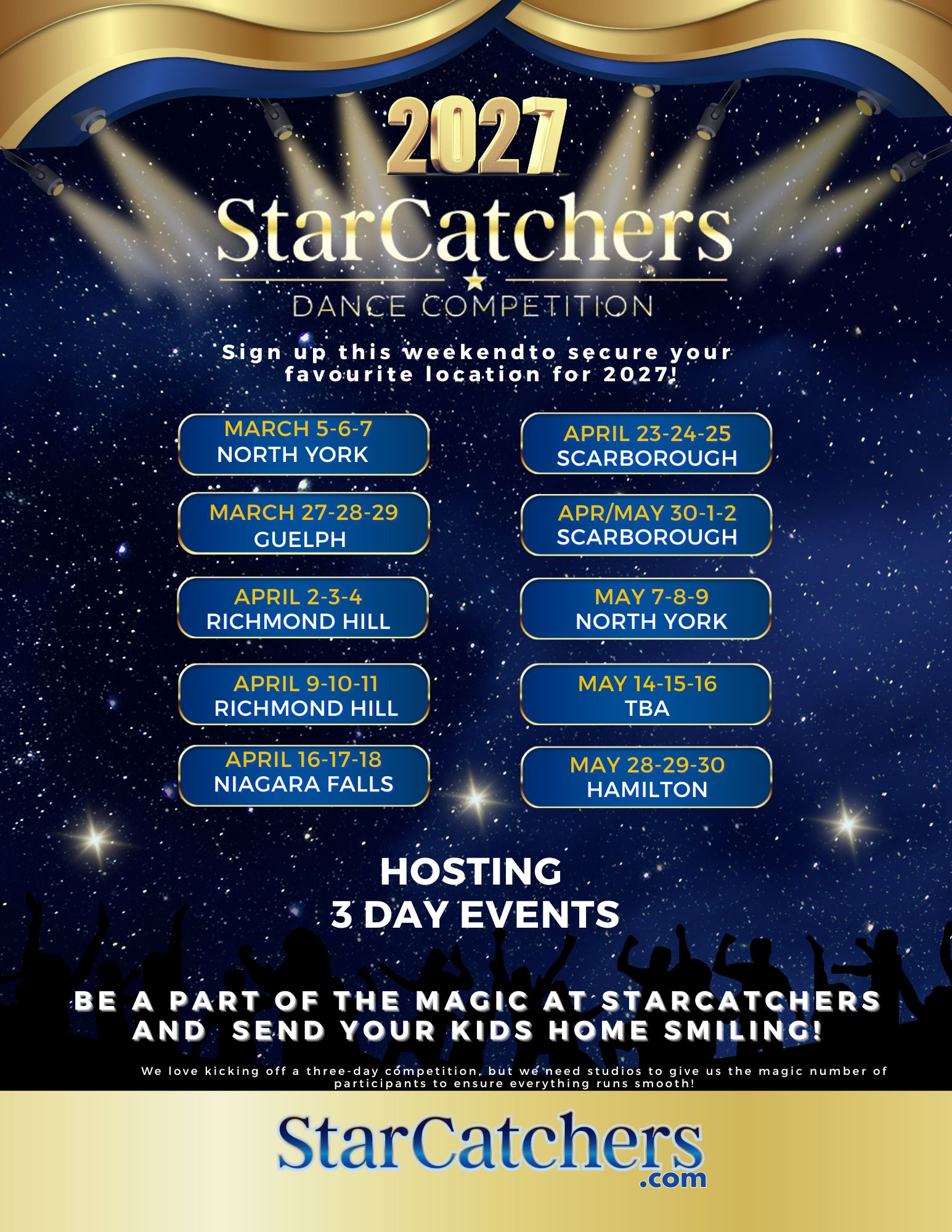 ***Studios provide an approximate number of entries when securing a location. StarCatchers tries to manage numbers that can be hosted within a 3 day event. From time to time, additional routines are added and the competition requires additional time for dancers, judges and teachers to prepare adequately and safely for dancers to be able to perform at their best levels.